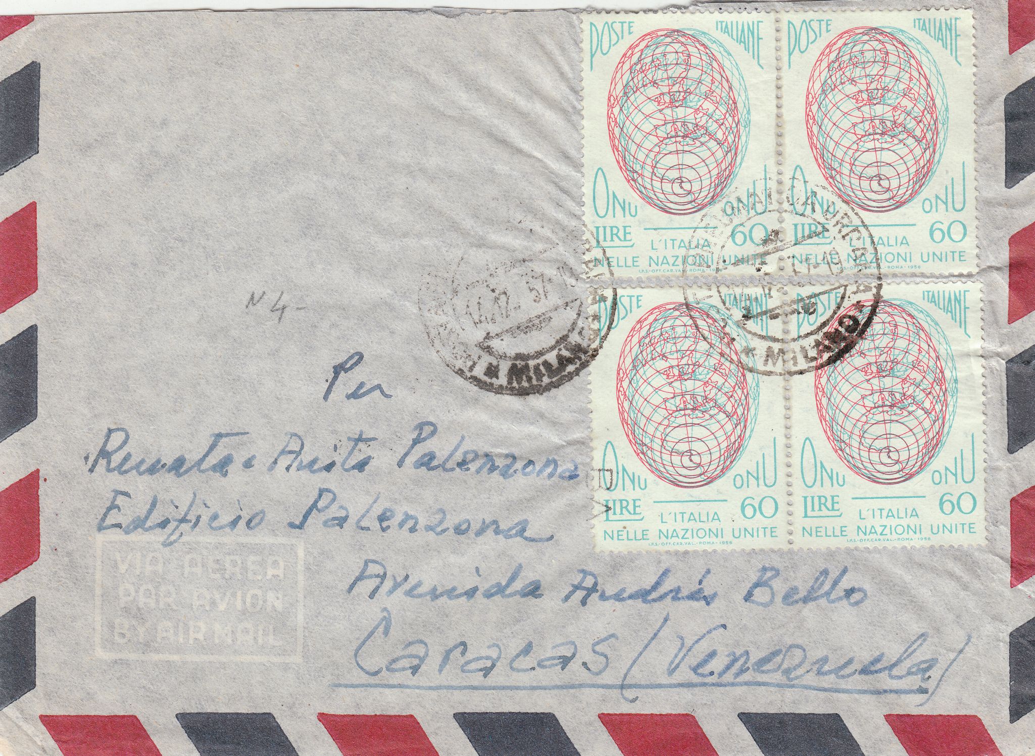 Die angenehme Überraschung war nach Erhalt der Beleges der Umstand, dass dieser Brief in Mailand per Rohrpost befördert wurde, was der Tagesstempel dokumentiert, den ich in meiner Freude bezüglich der Entdeckung des recht seltenen Operatorstempels der TRANSORMA in Caracas doch glatt übersehen hatte: