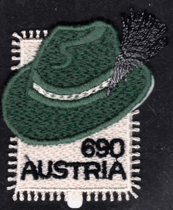 Der Steirerhut besteht aus einer Guipure-Stickerei auf Atlasgewebe. Die Marke ist als Einzelanfertigung, selbstklebend und teilweise mit zähnungsähnliche Fransen hergestellt.