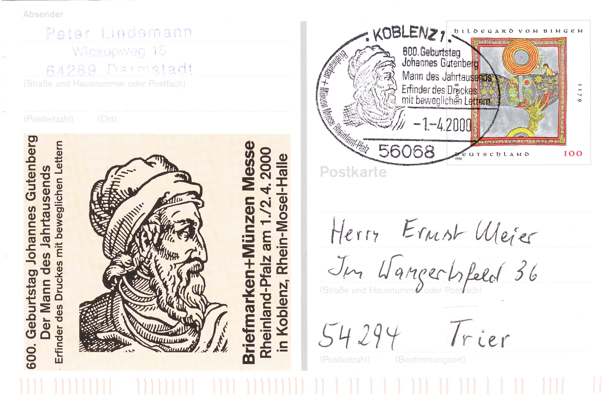 Gutenberg gilt als Erfinder des modernen Buchdrucks mit beweglichen Lettern. Die Verwendung von beweglichen Lettern revolutionierte ab 1450 die herkömmlichen Methoden der Buchproduktion und löste in Europa eine Medienrevolution aus. Gutenbergs Buchdruck breitete sich schnell in Europa und später in der ganzen Welt aus und wird als ein Schlüsselelement der Renaissance betrachtet. Insbesondere sein Hauptwerk, die Gutenberg-Bibel, zwischen 1452 und 1454 entstanden, wird allgemein für ihre hohe ästhetische und technische Qualität gerühmt. Diese Ganzsache erschien zu seinem 600. Geburtstag: