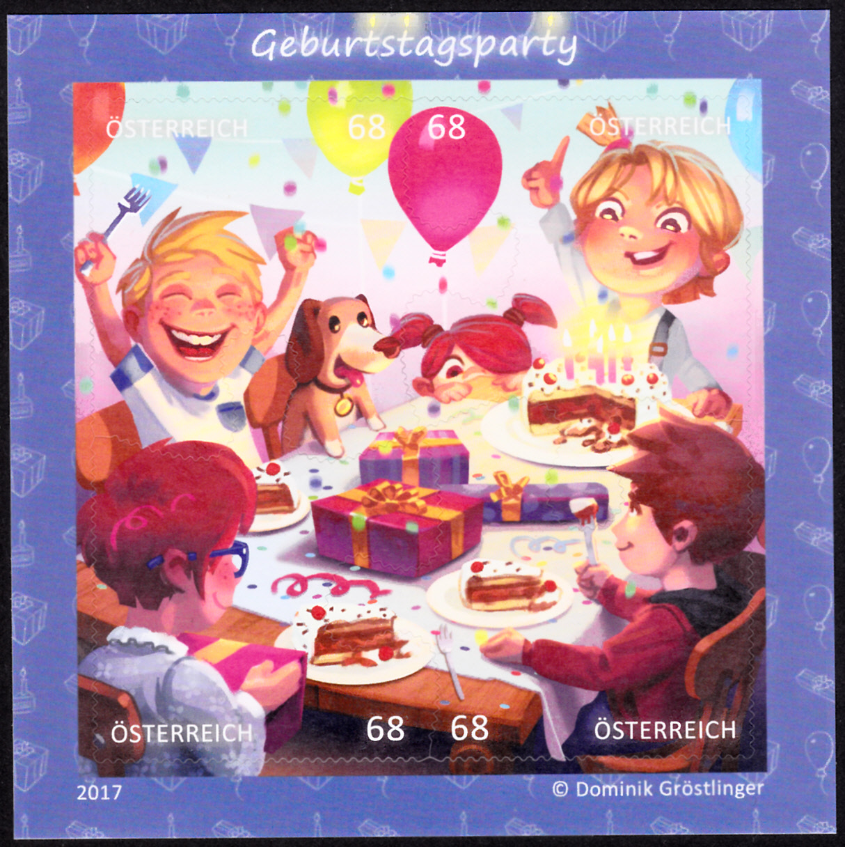Aus Österreich kommt diese Blockausgabe (MiNr Block 93 mit den Marken MiNr 3329 bis 3332) mit einem Comicmarken-Puzzle zum Thema "Geburtstagsparty". Sie zeigt Kinder beim Tortenessen auf einer Geburtstagsparty. Das besondere an dieser Ausgabe ist die Form der Marken als "Puzzleteile".