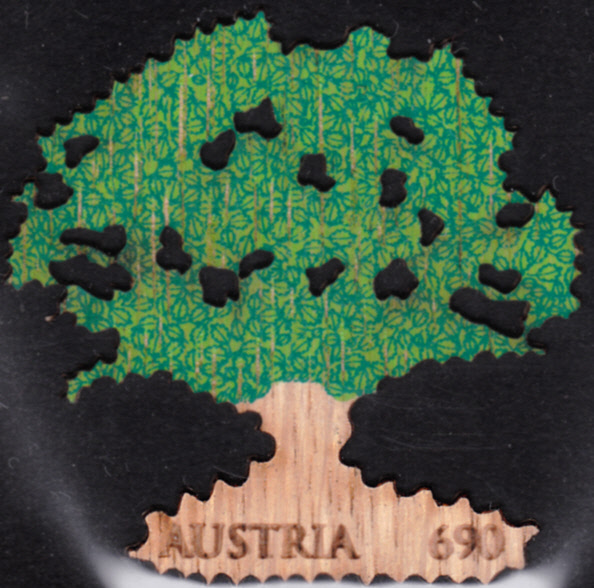 In Österreich ist 2017 eine "Marke" (MiNr 3352) mit einer Eiche erschienen. Sie wurde im Komb. Siebdruck und Laserbrand auf Holz in Einzelanfertigung hergestellt. Sie besteht aus Eichenfurnier und ist selbstklebend mit zähnungsähnlichem Laserschnitt.