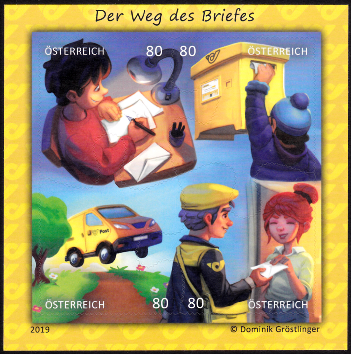 Es folgt auch gleich noch ein weiterer "Puzzle-Block" aus Österreich (MiNr Block 103 mit den Marken MiNr 3458 bis 3461) zum Thema "Der Weg des Briefes". Die Marken zeigen die Motive "Brief schreiben", "Einwurf in den Briefkasten", "Transport mit dem Postauto" und "Briefzustellung".