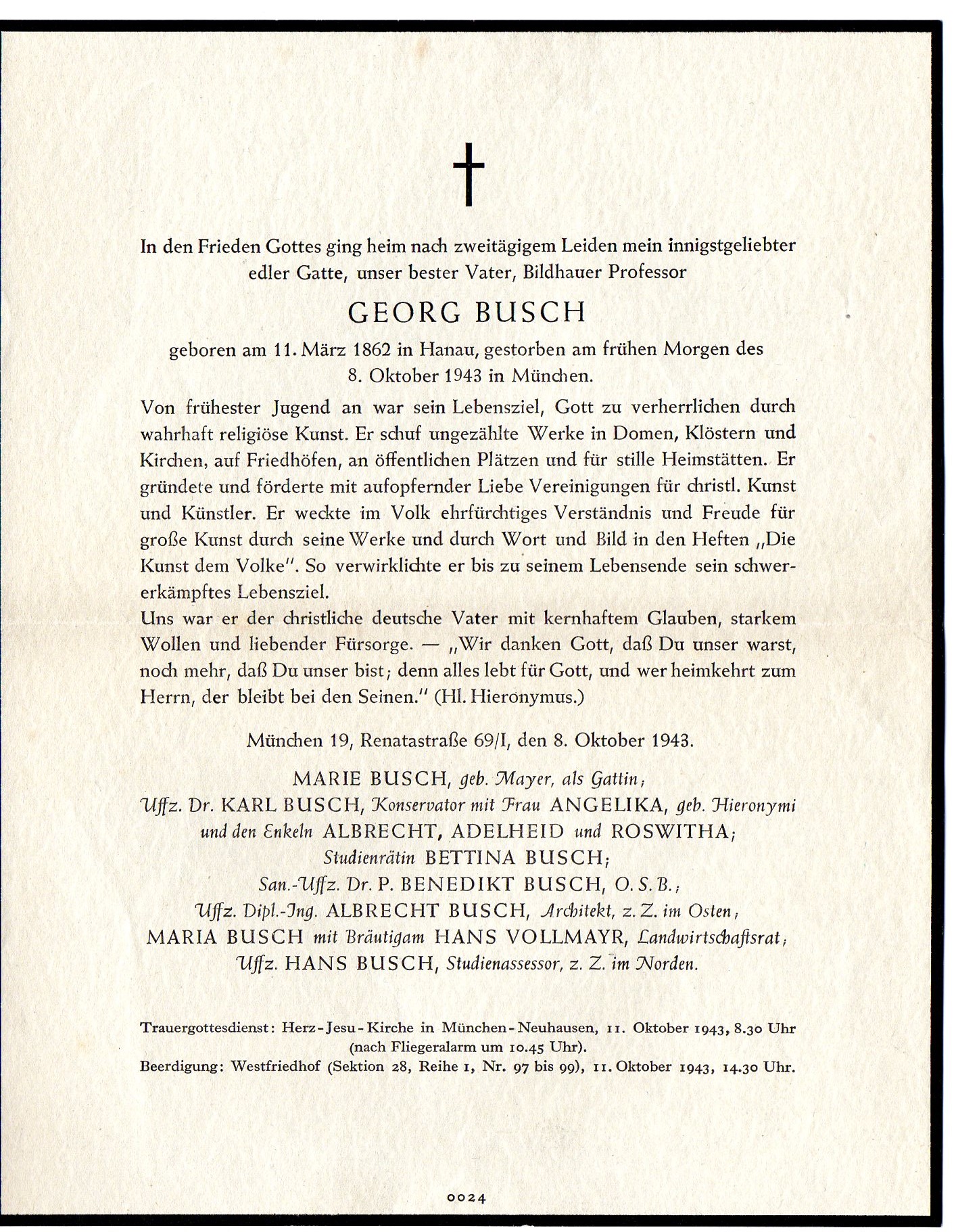 Darin enthalten waren insgesamt 3 Dokumente, 2 davon Traueranzeigen/Nachrufe und eine Bekanntmachung einer Hochzeit. Den Namen in den Traueranzeigen habe ich recherchiert und bin auf den Bildhauer Prof. Georg Busch gestoßen, der einer bekannten Bildhauerfamilie angehört und für seine christlichen Kunstwerke bekannt ist. Nähere Informationen findet ihr auf dieser sehr informativen Homepage: http://www.busch-steinheim.de/46801.html