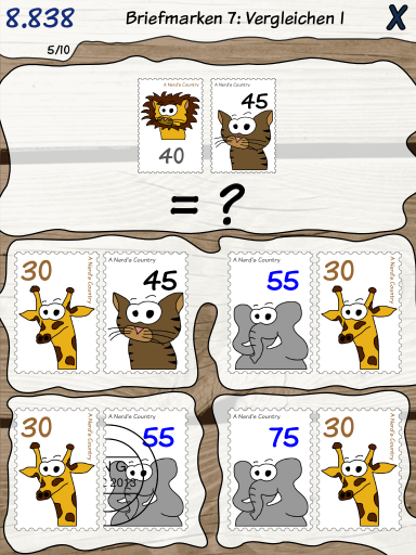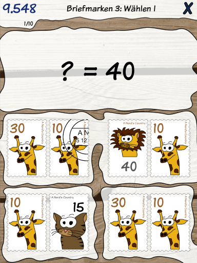 Was hat das mit Briefmarken zu tun? Nun, es geht um Rechenaufgaben, aber nicht im klassischen Stil, sondern anhand von Alltagsthemen, wie z.B. Münzen, Spielkarten und eben auch Briefmarken. Im Kern geht es natürlich um Rechnen, aber wo findet man schon ein Spiel, bei dem auch Briefmarken eine Rolle spielen? Ein Beispiel aus der App sind Fragen, bei denen die Werte von Briefmarken addiert werden müssen, wobei gestempelte Marken nicht mitgerechnet werden dürfen. Bilder sagen mehr als 1000 Worte, also hier ein paar Screenshots: