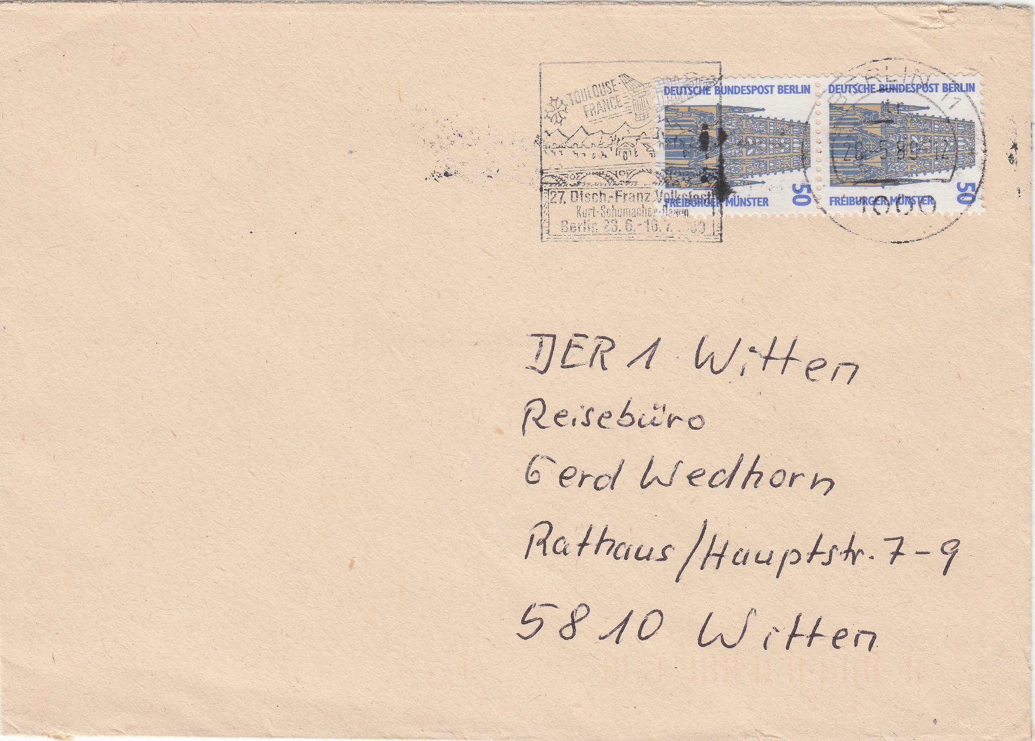 Dazu ein senkrechter 3-er-Streifen vom linken Bogenrand und ein senkrechtes Paar vom rechten Bogenrand auf einem Ortseinschreiben von Berlin. Auf dem linken Rand sind wieder die beiden Bogenzählnummern im Farbstreifen und im weissen Bogenrand zu sehen, dieses Mal aber weiter auseinander gezogen. Auf dem rechten Bogenrand ist die Formnummer 2 vorhanden. Gestempelt wurde mit dem Ersttagsonderstempel von Berlin am 6.11.87.