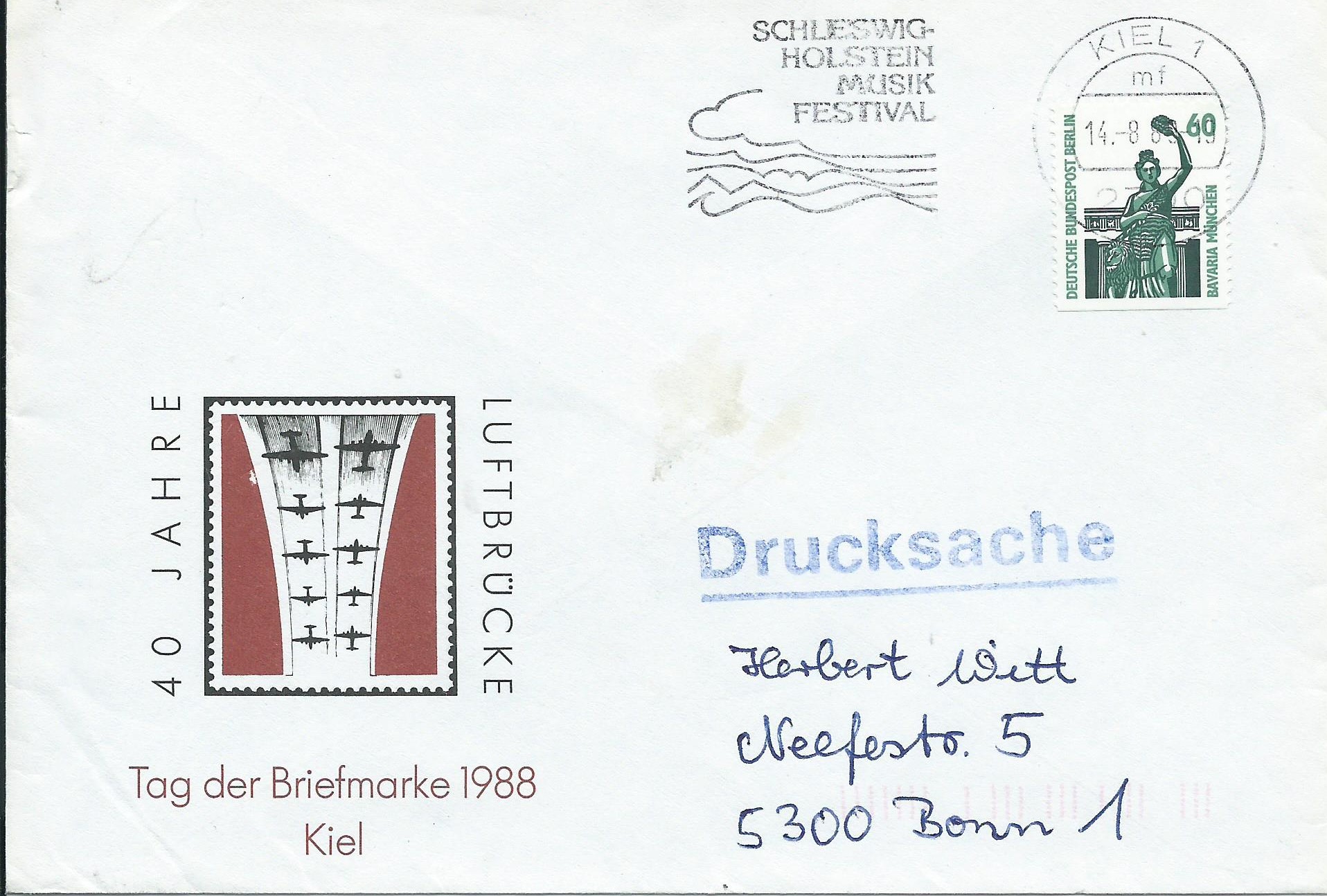 hier kommt ein Beleg, der gleich in 2 Wertstufen passt: Einmal zur 10 Pf und einmal zur 60 Pf-Marke. Von der 10 Pf-Marke sind ein waagrechtes und ein senkrechtes Paar verklebt worden, letzteres vom Bogenoberrand mit Reihenwertzähler 8,00 sowie ein Oberrandstück 60 Pf mit Reihenwertzähler 36,00. Gestempelt wurde der Beleg mit einem Sonderstempel von Frankfurt am Main am 27.9.90.