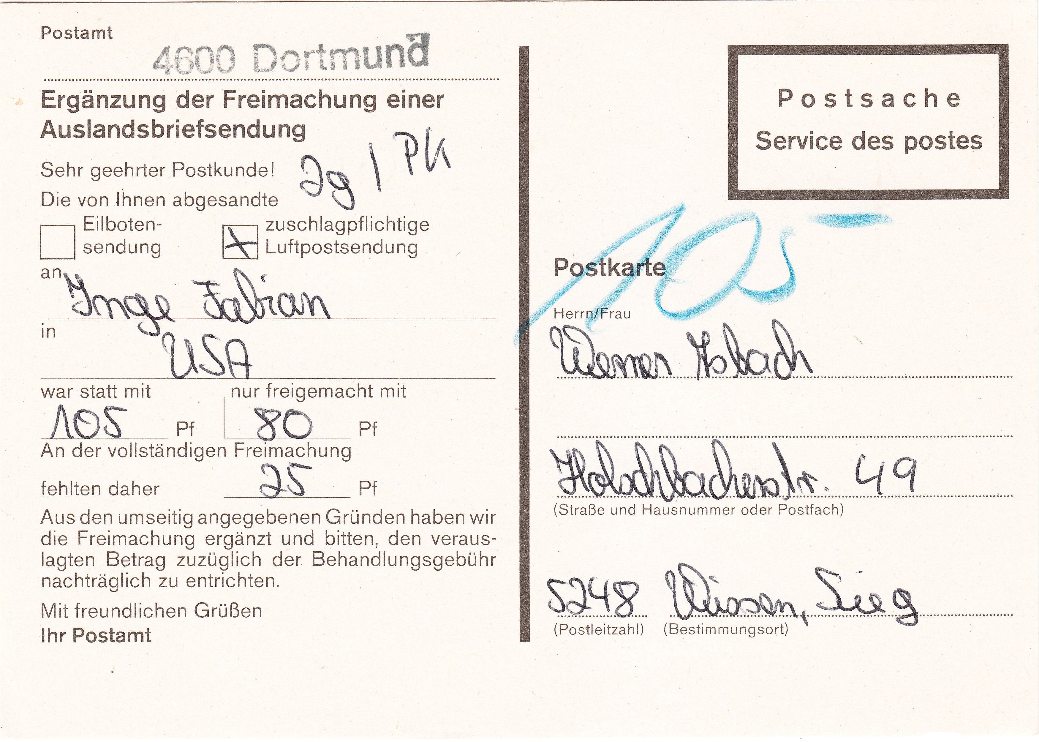 Diese 25 Pf plus 80 Pf "Behandlungsgebühr" wurden dann beim Absender per Postsache "Ergänzung der Freimachung einer Auslandsbriefsendung" als Nachgebühr erhoben: