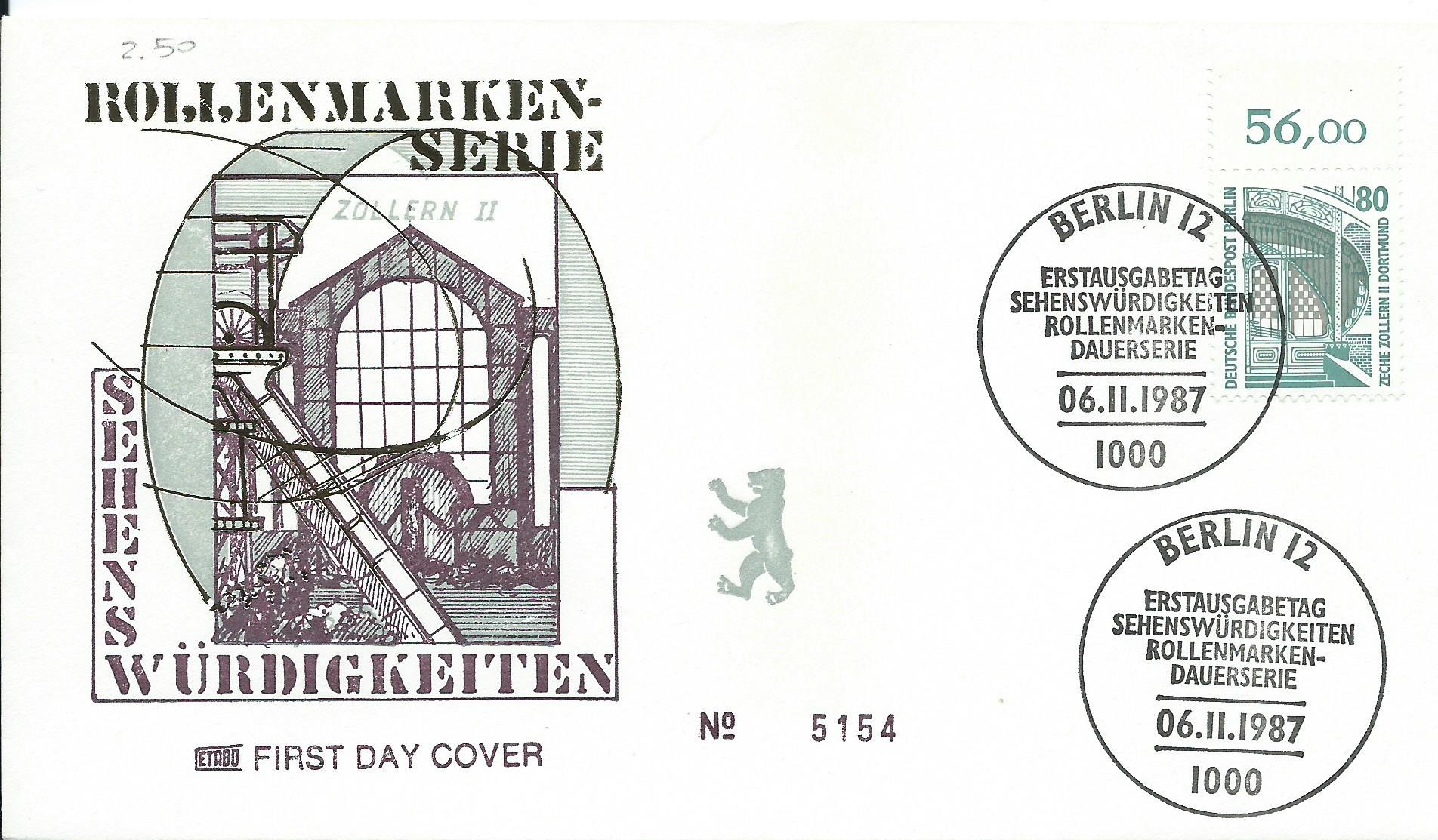 der 80 Pf-Wert vom Bogenoberrand mit Reihenwertzähler 56,00 auf Ersttagsbrief mit dem Ersttagstempel Berlin vom 6.11.87: