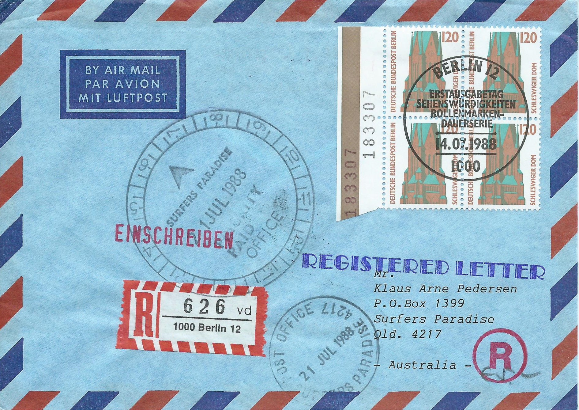 Einschreiben mit 3 Marken Mi.Nr. 815: Eine einzelmarke vom linken Bogenrand und ein senkrechtes Paar vom rechten Bogenrand mit "Formnummer" 2. Gestempelt in Berlin 12 am 8.9.89, also kann man das schon als "Datumsbrief" bezeichnen, wenn man die Zahlenfolge 8 9 8 9 betrachtet