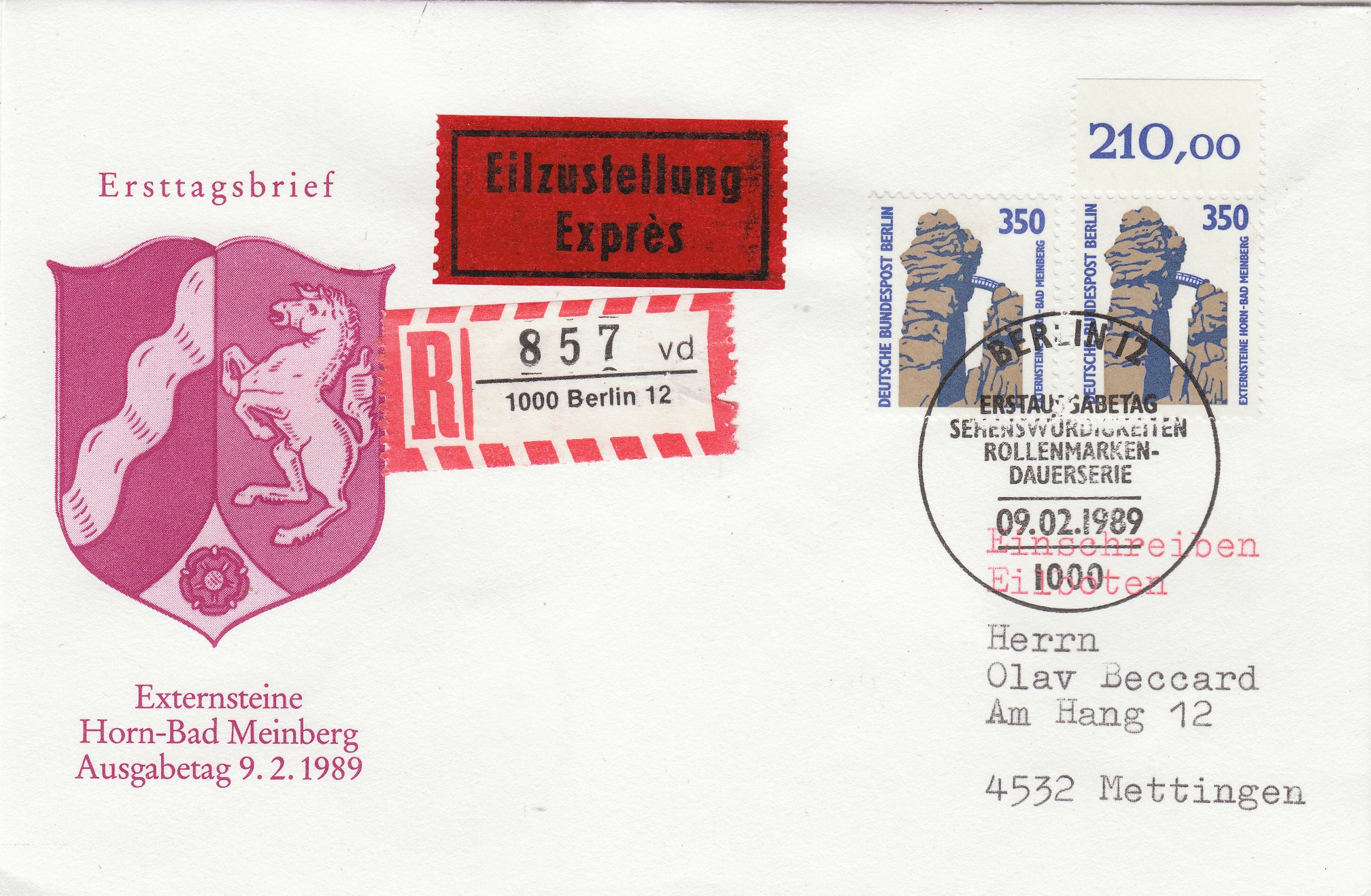 Das dokumentiert ein rückseitig abgeschlagener TSt BERLIN vom 16.02.1989 um 20 Uhr: