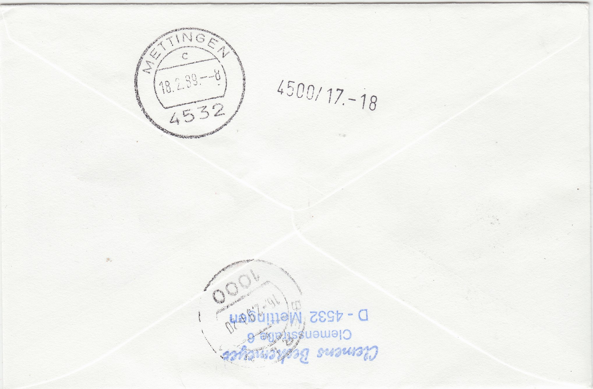 Am 17.02.1989 um 18 Uhr lief der Beleg dann in 4500 = Osnabrück durch, um am 18.2.1989 um 8 Uhr früh an seinem Bestimmungsort 4532 METTINGEN anzukommen.