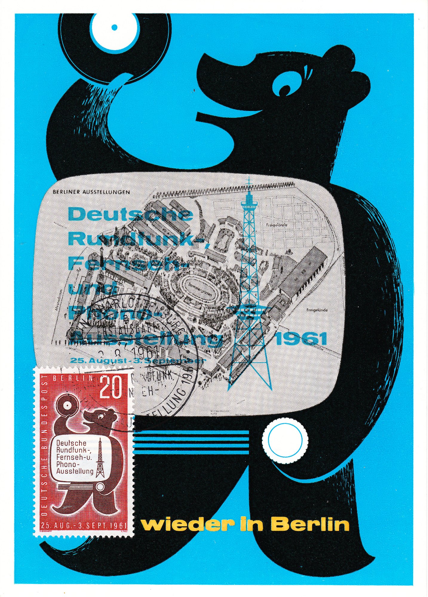 1955 wurde die Funkausstellung ein weiteres Mal in Düsseldorf sowie 1957 (20.) und 1959 die ersten Male in Frankfurt am Main veranstaltet; 1961 fand sie zum ersten Mal nach Kriegsende wieder in Berlin statt, was dieses Postwertzeichen sowie dieser Beleg dokumentieren: