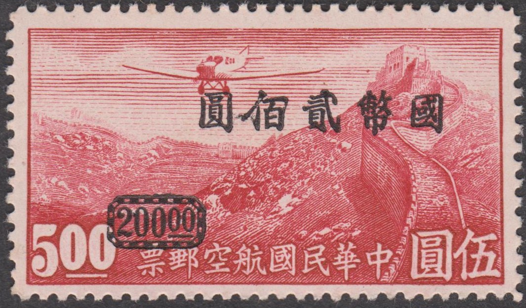 China MiNr. 684 erschien am 02.05.1946 und zeigt als Motiv Flugzeug über Chinesischen Mauer: