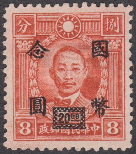 China MiNr. 716 erschien 1946, indem China MiNr. 328 mit einem schwaren Aufdruck 20 $ versehen wurde:
