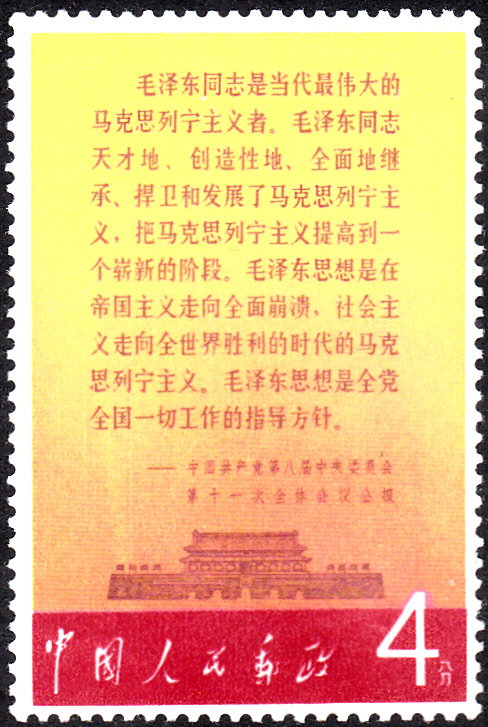 Am 1.Mai 1977 erschien in der Volksrepublik China eine Serie zum Thema "Mao Tse-tung und die von ihm aufgestellten Thesen". Auf dieser Marke (MiNr 977) wird ein Auszug aus dem Kommuniqué der 11. Sitzung des 8. Kongresses der Kommunistischen Partei Chinas über dem Tor des Himmlischen Friedens gezeigt.