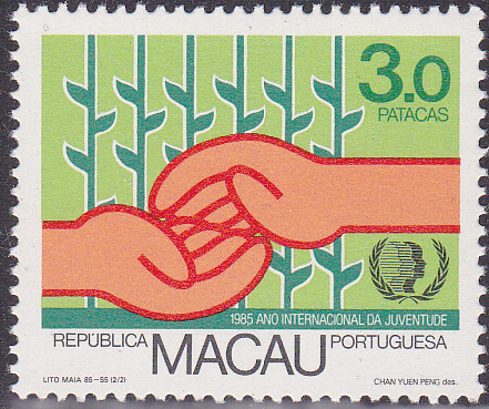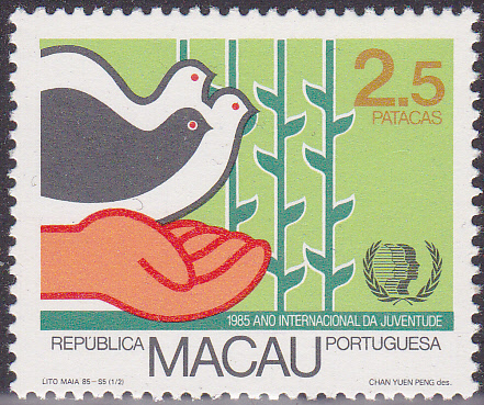 Zum Internationalen Jahr der Jugend ist bin Macau am 19. April 1985 diese Marke mit einer symbolischen Darstellung Hand mit Tauben (MiNr 533) erschienen.