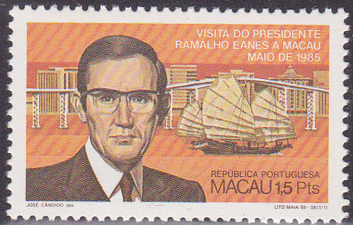 Am 27. Mai 1985 gab es in Macau eine Marke zum Besuch des Präsidenten von Portugal (MiNr 535). Die Marke zeigt den Staatspräsident Eanes vor Häusern Macaus, einer Brücke und einer Dschunke.