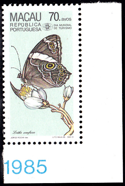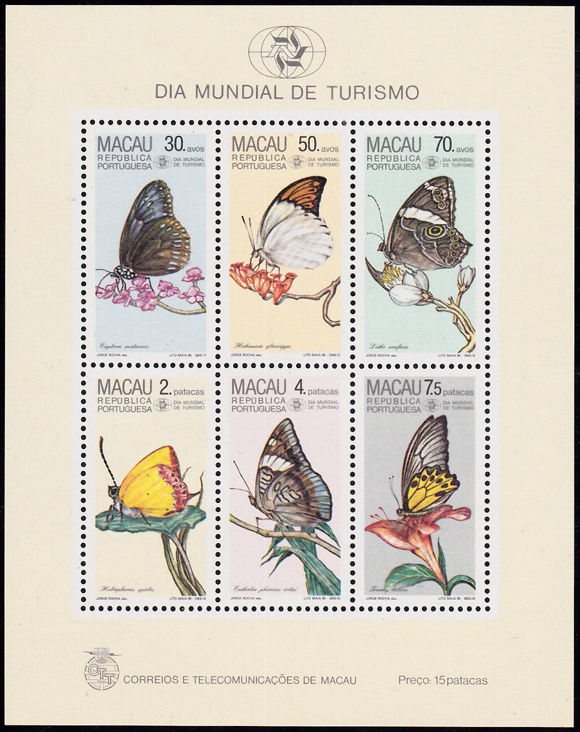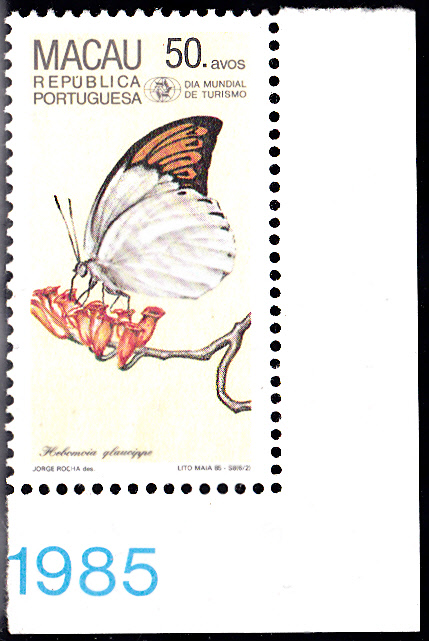 In Macau erschien 1985 zum Welttourismustag eine Serie mit Schmetterlingen. Hier die ersten beiden Marken als Eckrandstück: