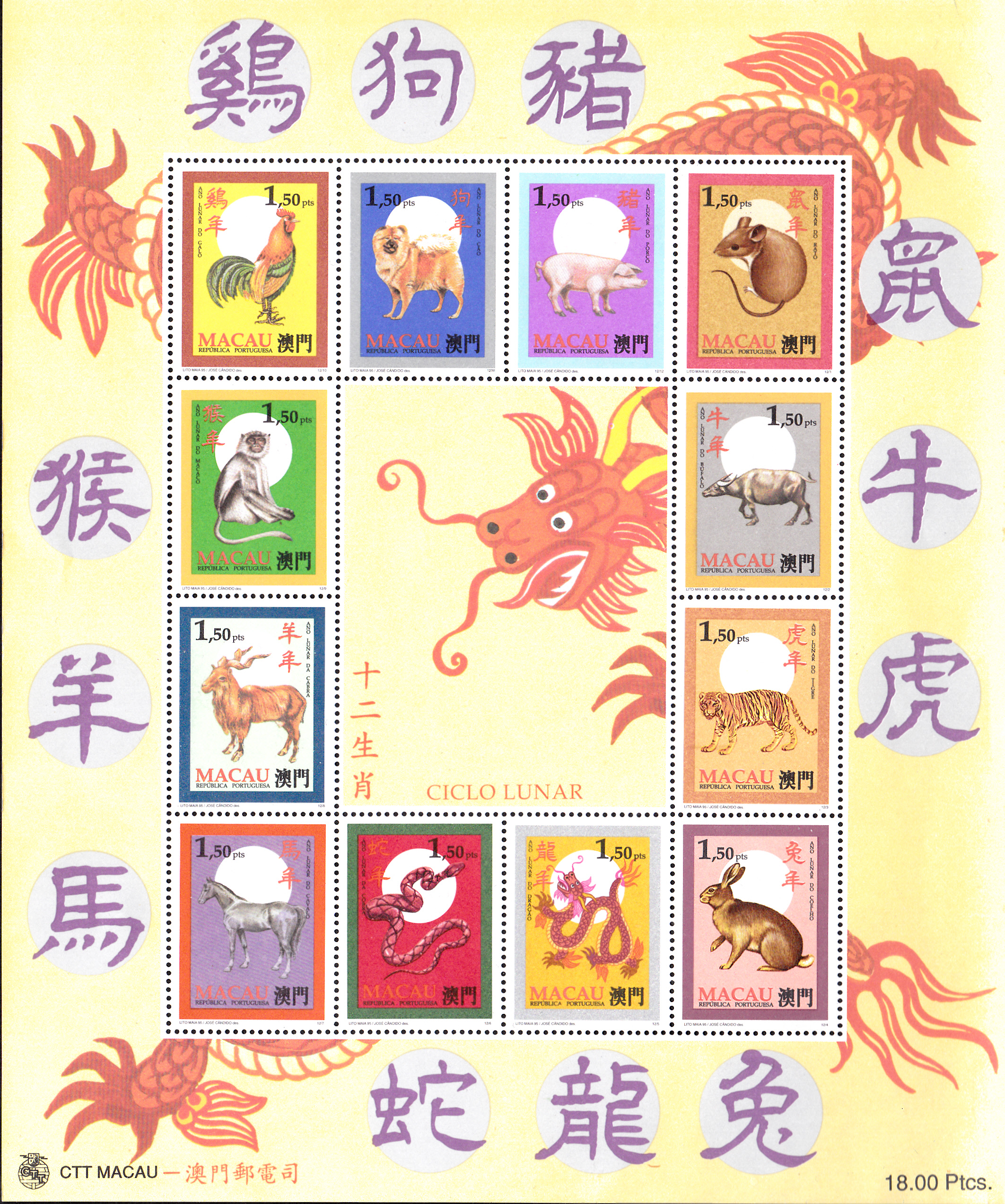 Die zuletzt gezeigten zwölf Marken zum Chinesischen Kalender wurden zusammenhängend in einem Bogen gedruckt. Dabei beginnt der 12-Jahre-Zyklus wie bei einer Uhr oben rechts. Die Marken für die einzelnen Jahre folgen dann im Uhrzeigersinn nacheinander.
