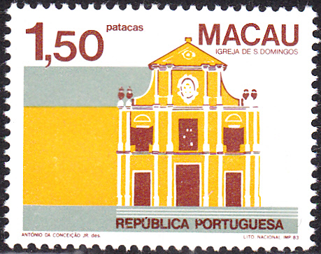 Die Marke zu 1,50 Patacas (MiNr 502) bildet die Kirche St. Dominik ab. Die Marke gibt es nur mit Druckvermerken mit Datum (MiNr 501 I).