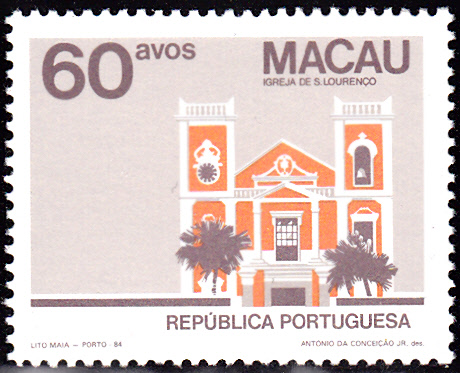 Auf der Marke zu 60 Avos (MiNr 518) ist die "St.-Lorenz-Kirche" in Macau zu sehen. Hier wieder eine Marke der ersten Auflage (MiNr 518 I) mit dem Druckvermerk "LITO MAIA - PORTO - 84" am Markenrand unten links.