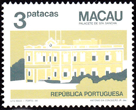 Auf der Marke zu 3 Patacas (MiNr 520) wird der St.-Sancha-Palast abgebildet. Auch hier eine Marke der ersten Auflage (MiNr 519 I) mit dem Druckvermerk "LITO MAIA - PORTO - 84" am Markenrand unten links.