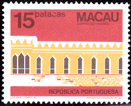 Als letzte Marke dieser Serie folgt hier noch die zu 15 Patacas (MiNr 521) mit der Abbildung des Polizeigebäudes wieder von der ersten Auflage (MiNr 521 I) mit dem Druckvermerk "LITO MAIA - PORTO - 84" am Markenrand unten links.