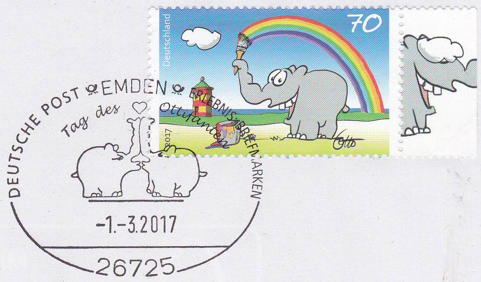 Am Ausgabetag gab es auch in Emden einen zur Marke passenden Sonderstempel mit zwei Ottifanten im Stempelbild.