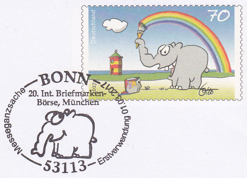 Für die selbstklebende Marke aus dem Markenset gab es einen Erstverwendungsstempel in Bonn, der natürlich auch einen Ottifanten zeigt.