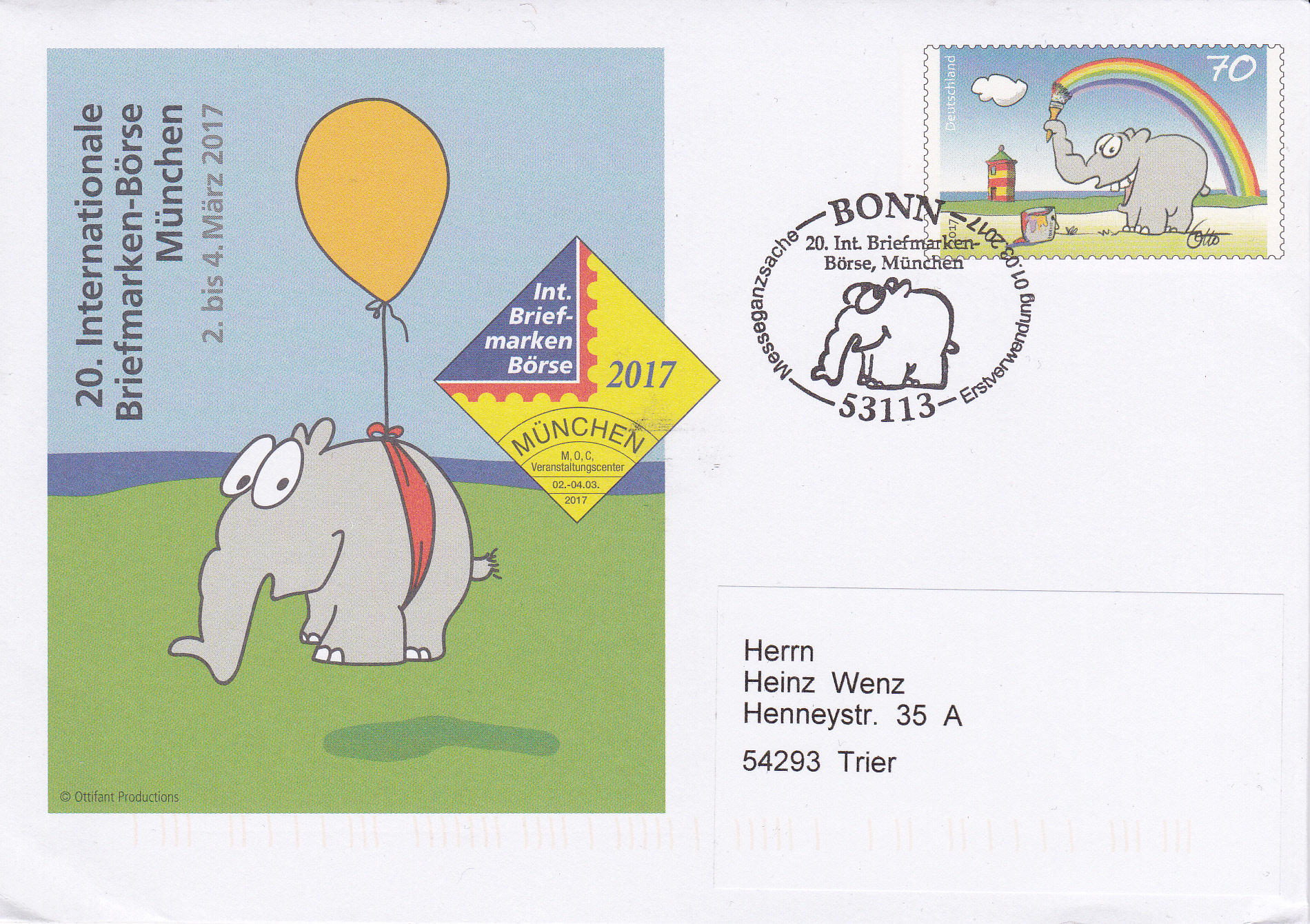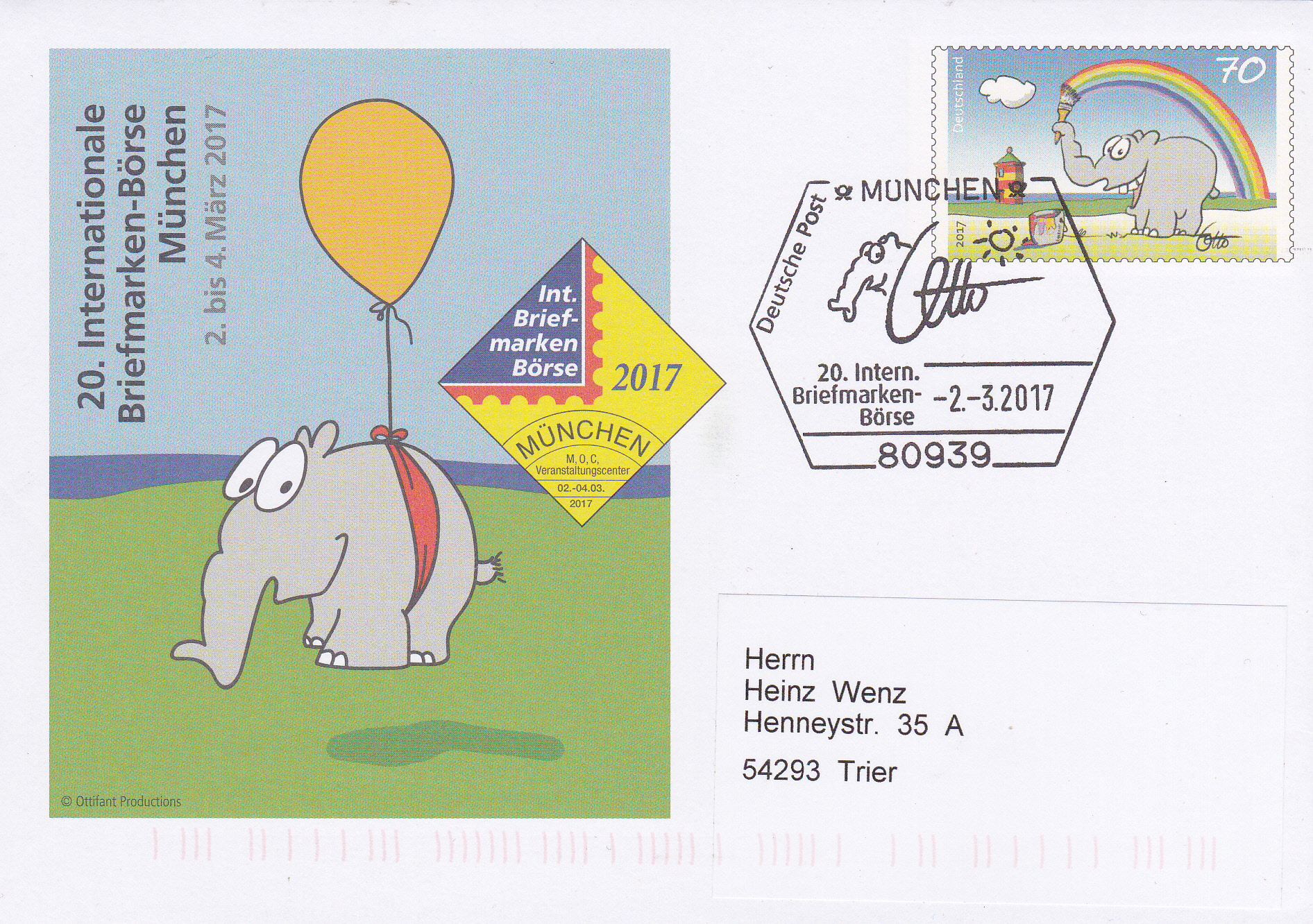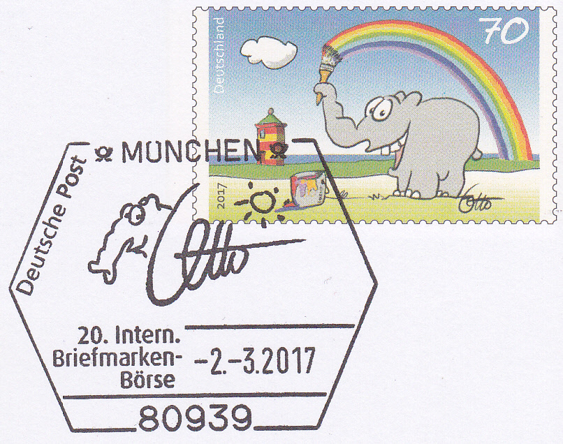 Passend zur Messeganzsache gab es bei der Briefmarken-Börse in München auch einen Sonderstempel mit einem Ottifanten und der Unterschrift von Otto.