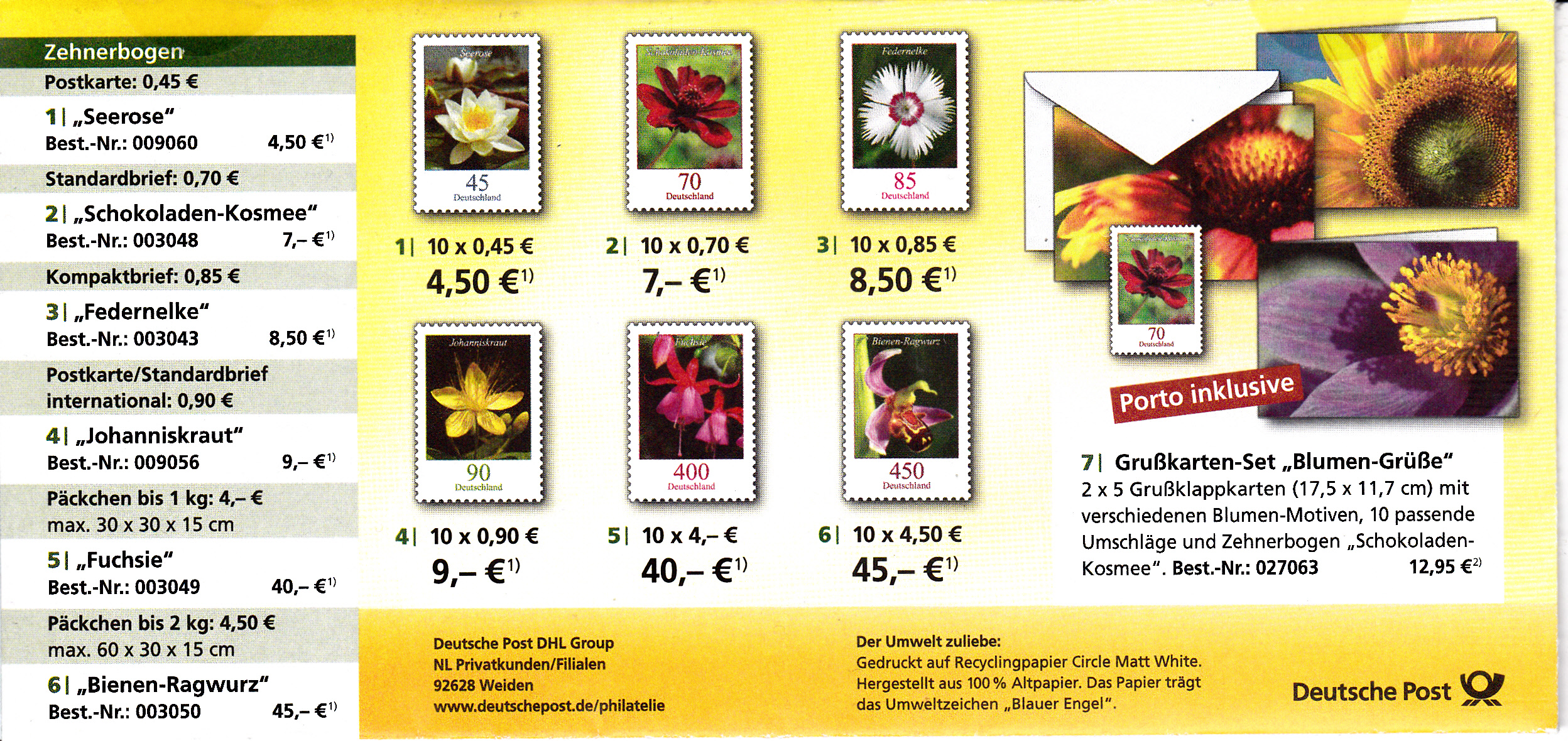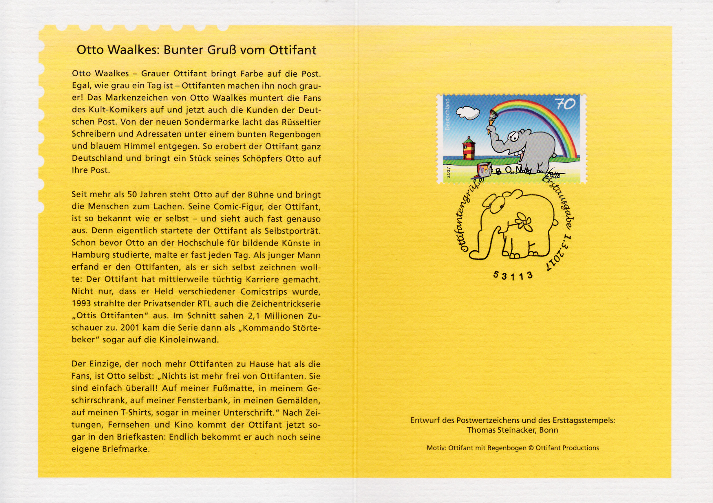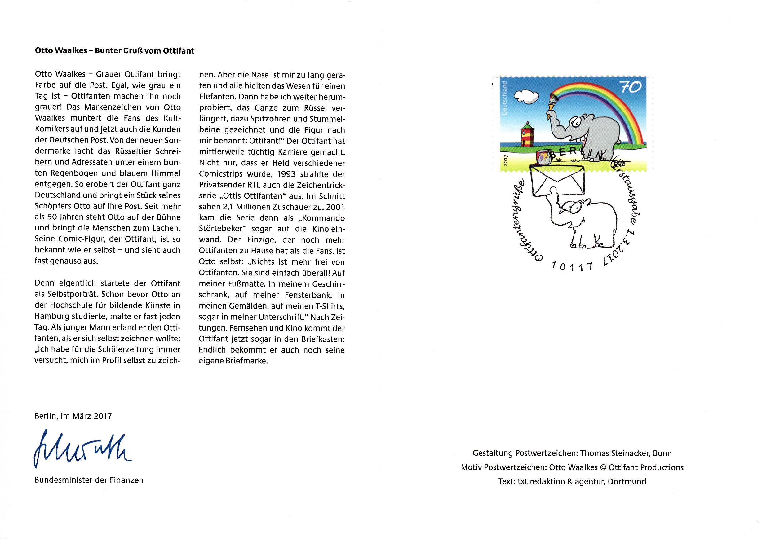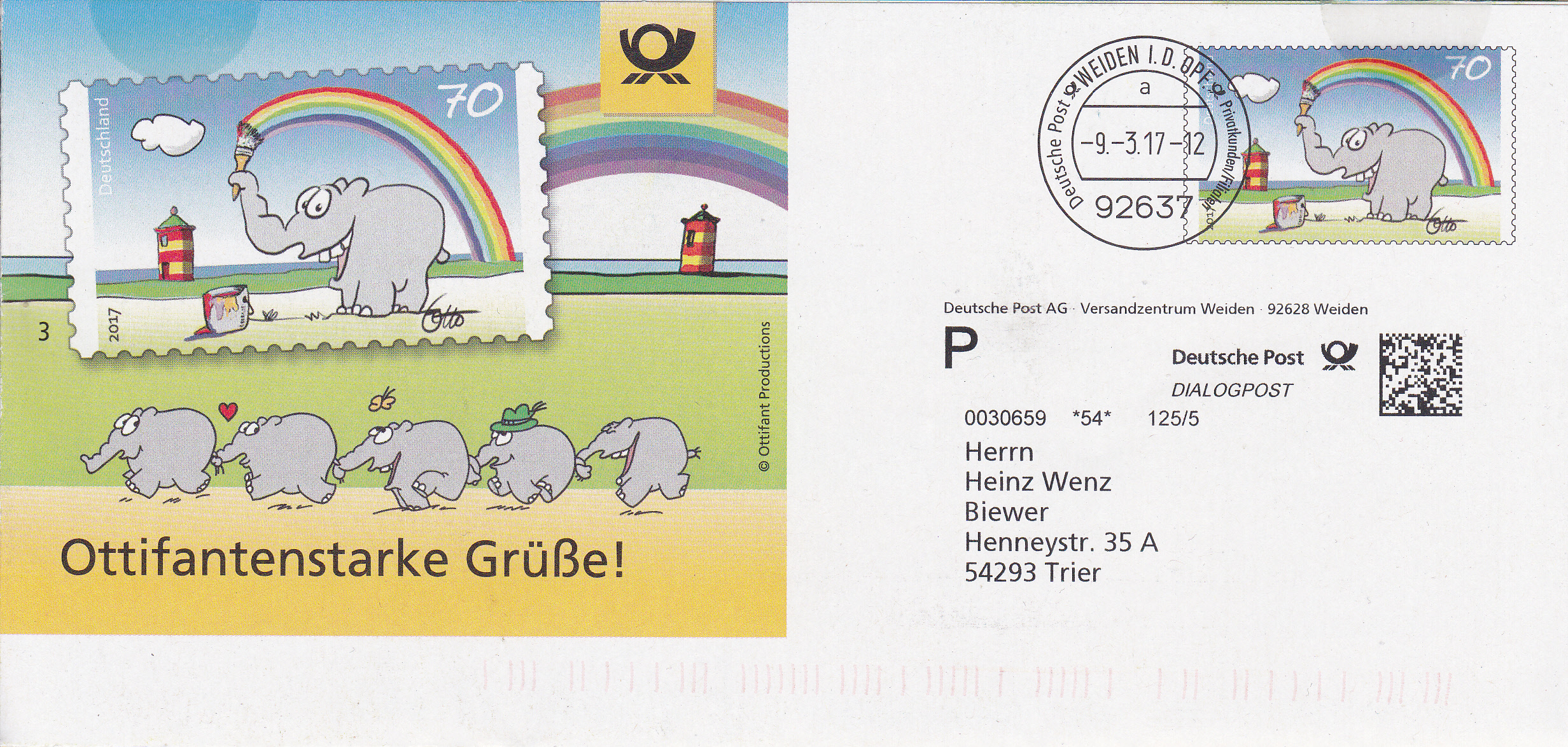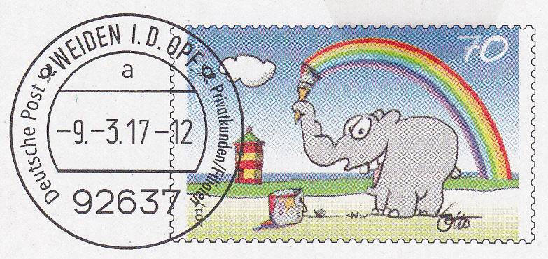 Faltbrief 210 mm x 102 mm mit Wertstempel der 70C-Marke mit der Zeichnung "Bunter Gruß vom Ottifant" von Otto Waalkes (MiNr 3292) mit aufgedruckter Zähnung und Vorausentwertung "Deutsche Post (Posthorn) WEIDEN I.D.OPF (Posthorn) Privatkunden/Filialen / a / -9.-3.17-12". Diese Ganzsache ist eine Eigenausgabe der Deutschen Post AG.
