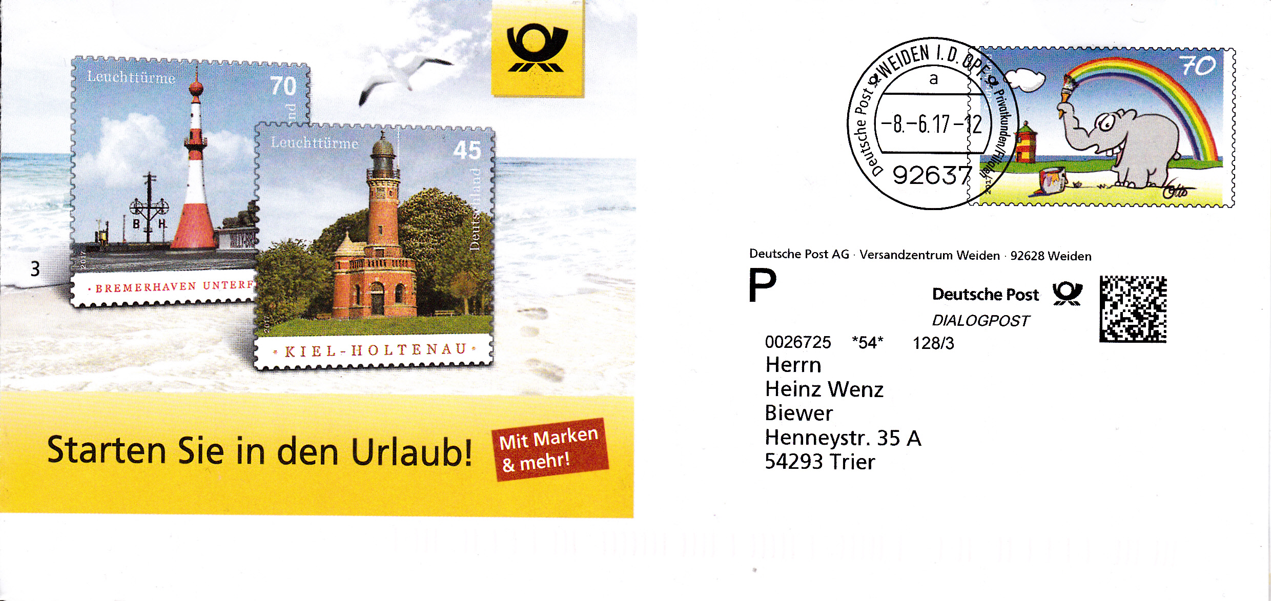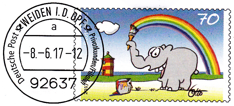 Faltbrief 210 mm x 102 mm mit Wertstempel der 70C-Marke mit der Zeichnung "Bunter Gruß vom Ottifant" von Otto Waalkes (MiNr 3292) mit aufgedruckter Zähnung und Vorausentwertung "Deutsche Post (Posthorn) WEIDEN I.D.OPF (Posthorn) Privatkunden/Filialen / a / -8.-6.17-12". Diese Ganzsache ist eine Eigenausgabe der Deutschen Post AG.