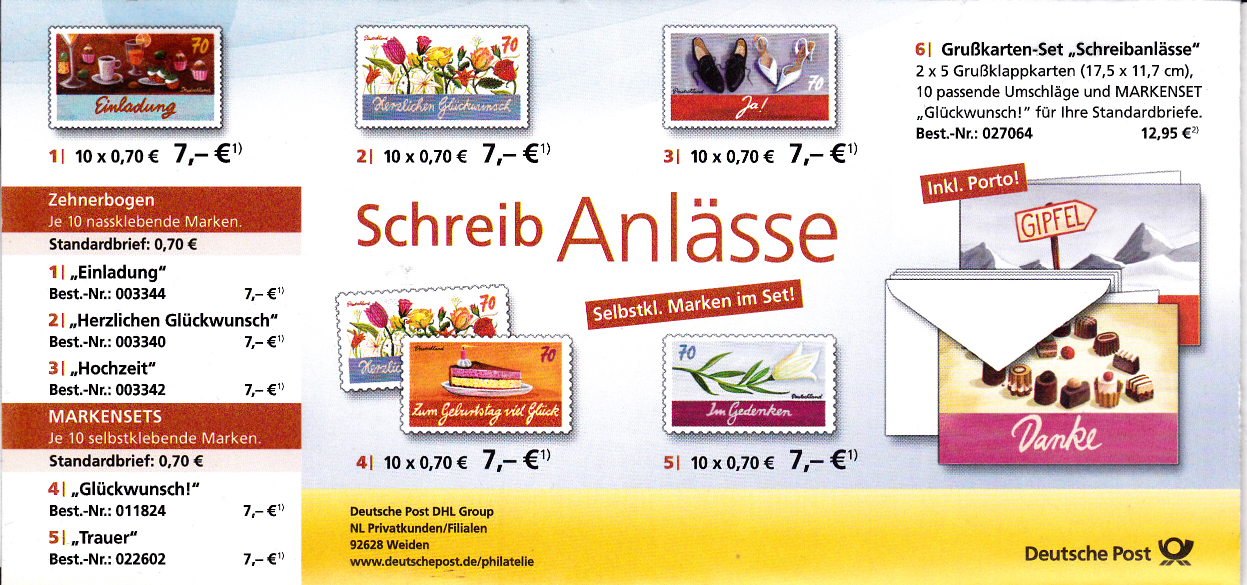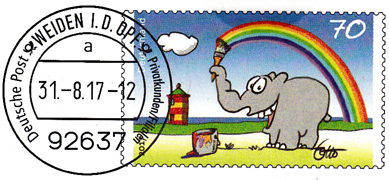 Faltbrief 210 mm x 102 mm mit Wertstempel der 70C-Marke mit der Zeichnung "Bunter Gruß vom Ottifant" von Otto Waalkes (MiNr 3292) mit aufgedruckter Zähnung und Vorausentwertung "Deutsche Post (Posthorn) WEIDEN I.D.OPF (Posthorn) Privatkunden/Filialen / a / 31.-8.17-12". Diese Ganzsache ist eine Eigenausgabe der Deutschen Post AG.