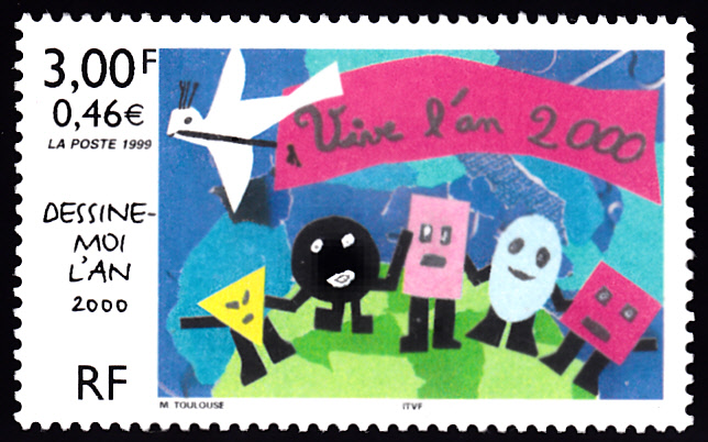 Zum Internationalen Malwettbewerb für Kinder "Zukunft auf Briefmarken" gab es auch in Frankreich Marke (MiNr 3402) mit der Kinderzeichnung "Es lebe das Jahr 2000" von Morgane Toulouse (9 J.).