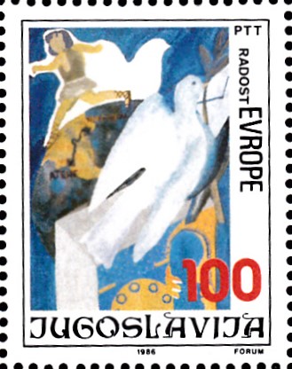 Auf der Marke aus Jugoslawien (MiNr 2194) zum Europäischen Kindertreffen "Freude Europas" im Jahre 1986 zeigt die Kinderzeichnung "Friedenstaube, Kind auf Weltkugel" von Tanja Faletic (14 J.).