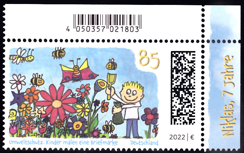 Die Marke (MiNr 3701) zeigt die Zeichnung "Junge sät Blumen für Insekten" nach dem Siegerentwurf des Malwettbewerbs von einem 7-jährigen Niklas aus Bayern. Ob dieser Entwurf tatsächlich von einem 7-jährigen stammt? Gie gezeigte Marke kommt vom Eckrand mit EAN-Codierung.