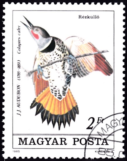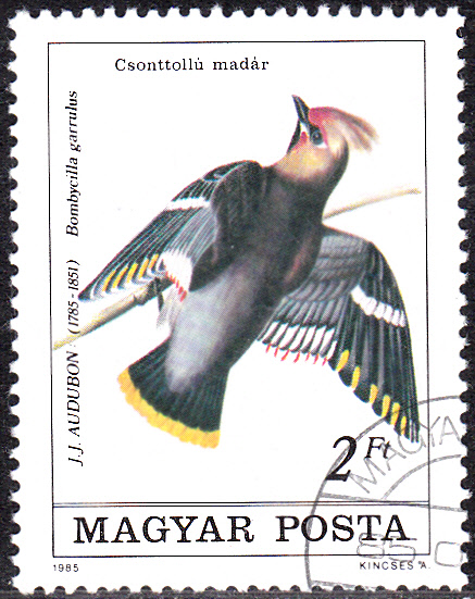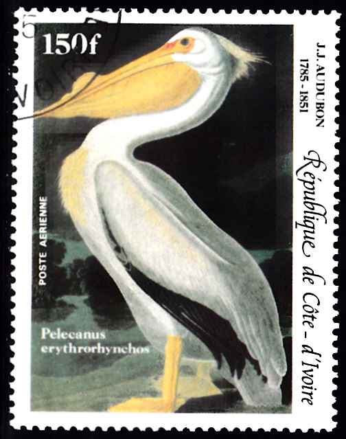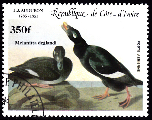 Die Vögel Amerikas (Birds of America) umfasst 435 handcolorierte Bildtafeln mit der Darstellung von mehr als 1.000 Exemplaren. Zum 200. Geburtstag von John James Audubon ist in der Elfenbeinküste in einer Serie diese Marke (MiNr 853) mit der Zeichnung "Mittelsäger (Mergus serrator)" von John James Audubon.