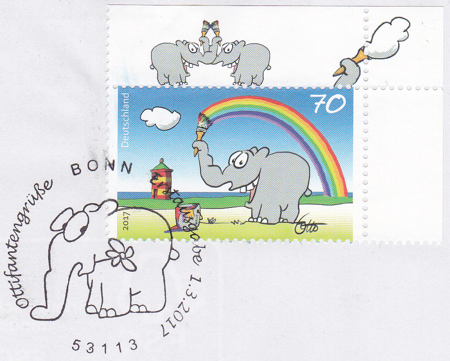 Bei der Deutschen Post AG ist am 1.3.2017 eine Marke (MiNr 3292) mit der Zeichnung "Bunter Gruß vom Ottifant" von Otto Waalkes erschienen.