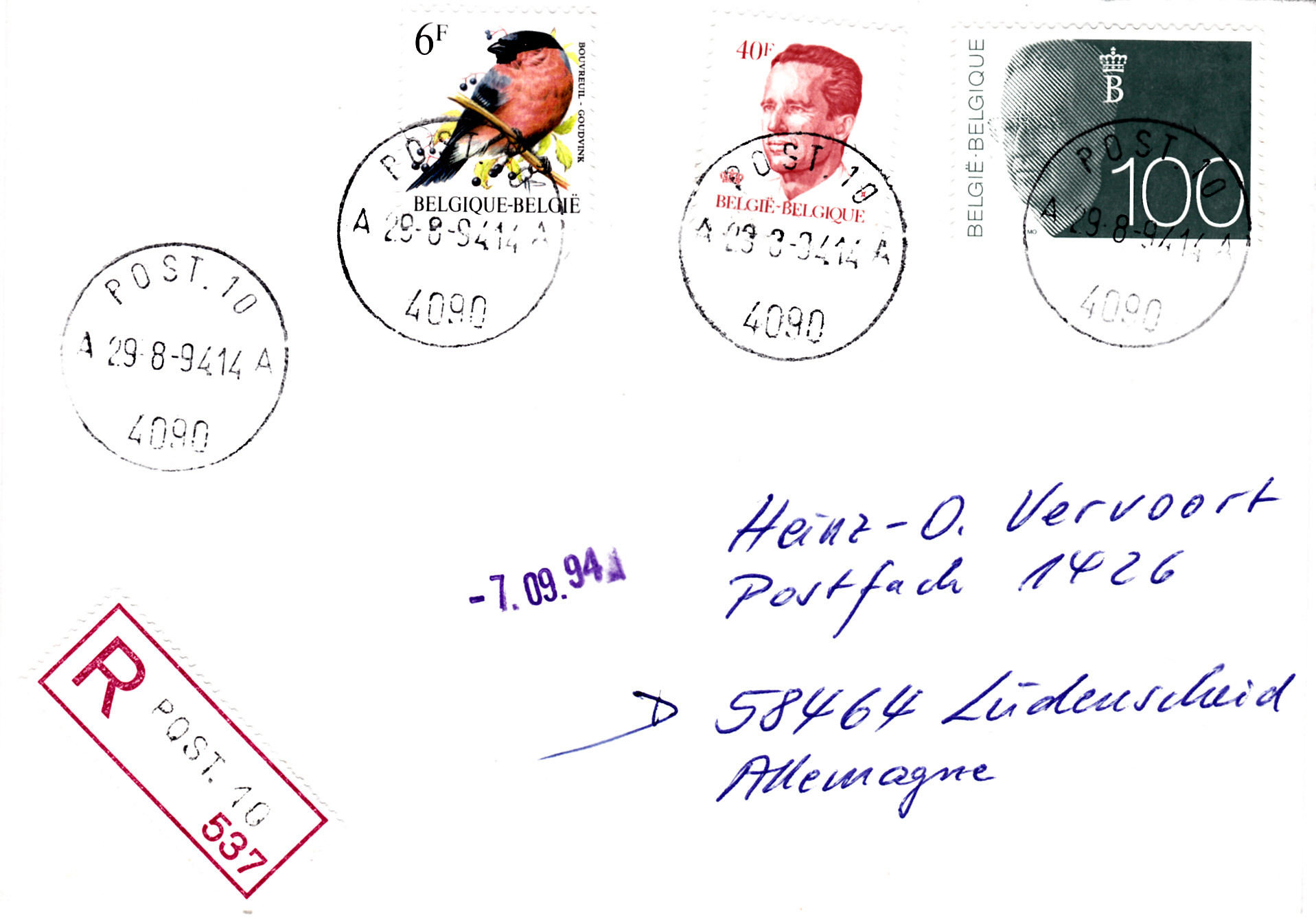 Die bereits hier gezeigte Marke aus Belgien (MiNr 2347) mit einem Gimpel (Pyrrhula pyrrhula) ist auf diesem Brief mit Einschreiben zusammen mit anderen marken zur Frankatur verwendet worden.