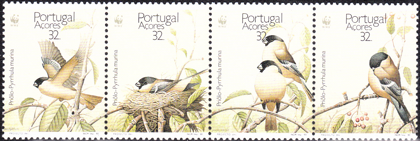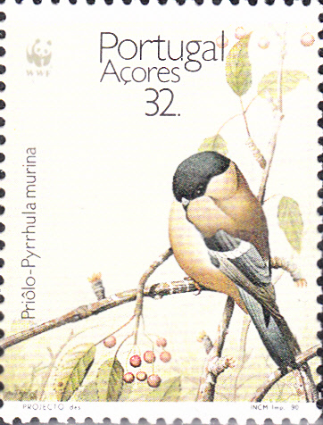 Eine weitere Marke (MiNr 406) zeigt ein Pärchen des Azorengimpel (Pyrrhula murina).