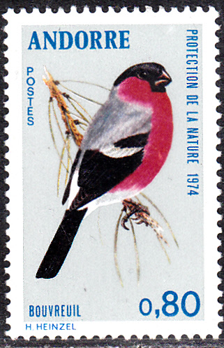 Diese Marke der französische Post in Andorra (MiNr 262) stellt uns einen weiteren Dompfaff (Pyrrhula pyrrhula) vor.
