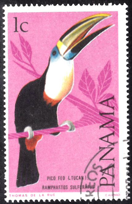 Auf dieser Marke (MiNr 1357) aus Sao Tomé und Principe (ein Inselstaat im Golf von Guinea) soll laut Angabe auf der Marke ein Tukan aus der Gattung Ramphastos zu sehen sein. Dem auf der Marke angegebenen Namen Ramphastos maximus konnte ich in der Auflistung der Arten in der Gattung nicht auffinden. Nach langem Suchen komme ich zur Meinung dass die Marke einen Dottertukan der Unterart Ramphastos vitellinus Ariel, der auch Arieltukan genannt wird, zeigt. Diese Unterart kommt in Brasilien südlich des Amazonas vor.
