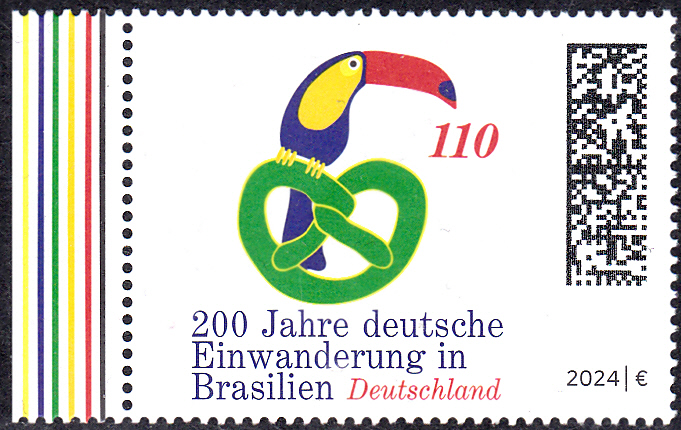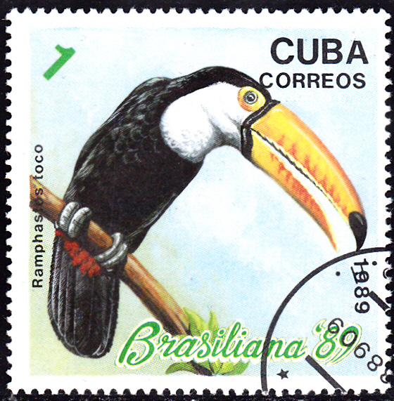 Auf dieser Marke (MiNr 1357) aus Sao Tomé und Principe (ein Inselstaat im Golf von Guinea) soll laut Angabe auf der Marke ein Tukan aus der Gattung Ramphastos zu sehen sein. Dem auf der Marke angegebenen Namen Ramphastos maximus konnte ich in der Auflistung der Arten in der Gattung nicht auffinden. Nach langem Suchen komme ich zur Meinung dass die Marke einen Dottertukan der Unterart Ramphastos vitellinus Ariel, der auch Arieltukan genannt wird, zeigt. Diese Unterart kommt in Brasilien südlich des Amazonas vor.