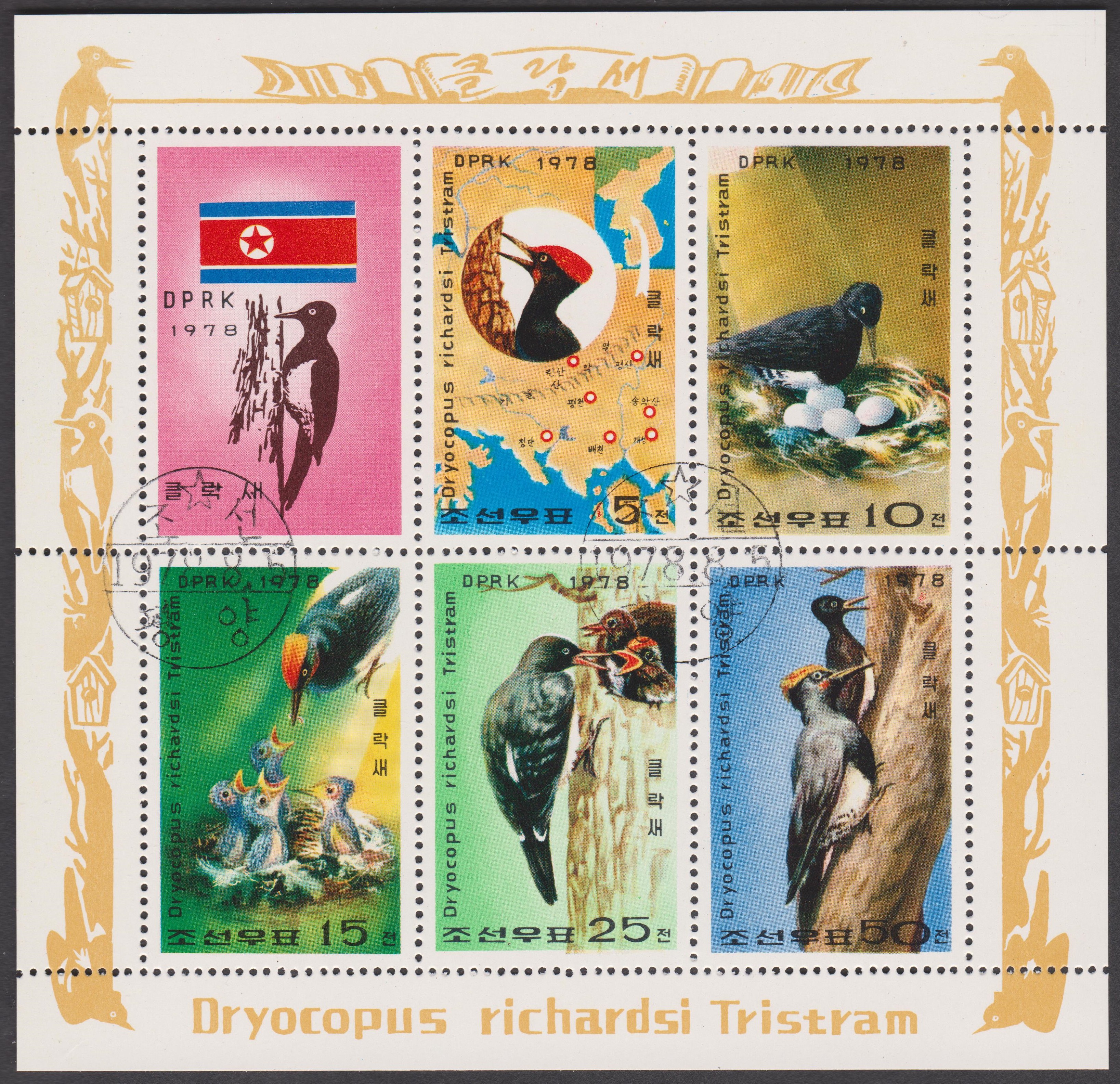 Hier eine Marke aus Korea-Nord (MiNr 1791) mit einem Tristrams Specht (Dryocopus javensis richardsi), der auch als Korea-Weißbauch-Schwarzspecht bezeichnet wird, einer in Korea beheimatete Unterart des Weißbauchspechtes. Die Abbildung zeigt ein Weibchen in der Nesthöhle mit vier Eier.