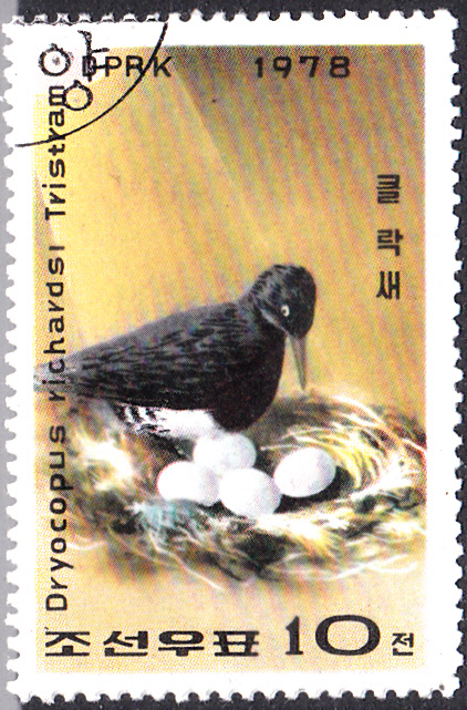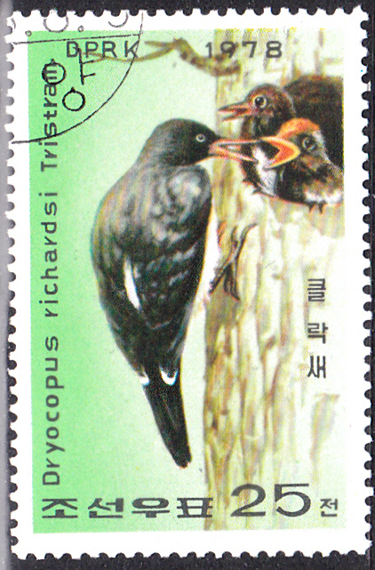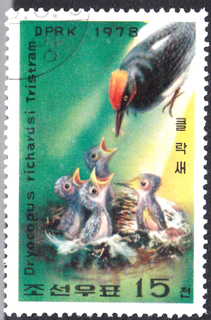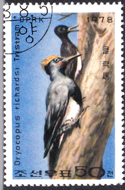 Hier eine Marke aus Korea-Nord (MiNr 1791) mit einem Tristrams Specht (Dryocopus javensis richardsi), der auch als Korea-Weißbauch-Schwarzspecht bezeichnet wird, einer in Korea beheimatete Unterart des Weißbauchspechtes. Die Abbildung zeigt ein Weibchen in der Nesthöhle mit vier Eier.