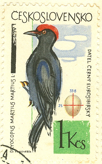 Eine Marke aus einer tschechoslowakischen Vogelmotiv-Ausgabe des Jahres 1964 (MiNr 1498) zeigt einen solchen Schwarzspecht.