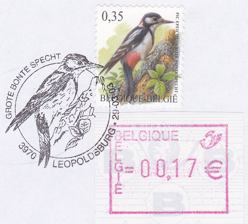 In der Dauerserie "Vögel" erschien in Belgien eine Marke mit einem Buntspecht (Dendrocopos major). Hier ein Exemplar auf einem gelaufenem Ersttagsbrief mit einem bildgleichen Sonderstempel.