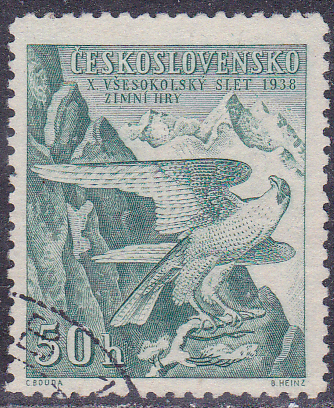 Auf den zwei Marken aus der Tschechoslowakei zu den 10. Sokol-Winterspiele in der Hohen Tatra ist ein Wanderfalke (Falco peregrinus) abgebildet.