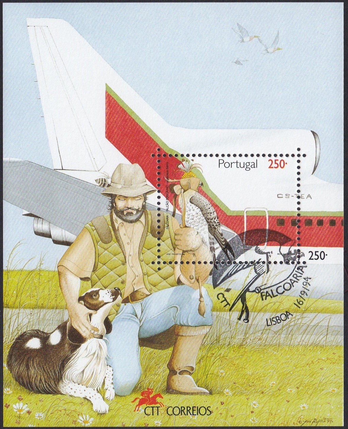 Zu dieser Ausgabe aus Portugal gehört auch noch ein Block (MiNr Block 102 mit Marke MiNr 2036). Die Marke zeigt einen Falken mit Haube. Auf dem Blockrand Ist ein Falkner mit seinem Hund vor einem Flugzeug abgebildet.