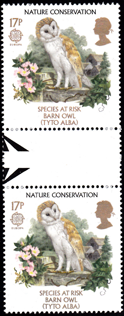 In Großbritannien erschien die Europamarken 1986 zu 17 Pence (MiNr 1068) zum Gemeinschaftsthema "Natur- und Umweltschutz" mit einer Schleiereule (Tyto alba). Hier ein Zwischenstegpaar dieser Marke.